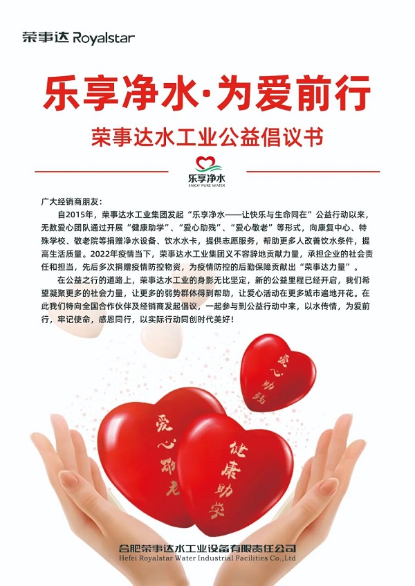 • 榮事達水工業向全國各地合作伙伴及經銷商發起公益倡議,呼吁大家一起參與到公益行動中來,以水傳情,為愛前行,牢記使命,感恩同行,以實際行動同創時代美好!