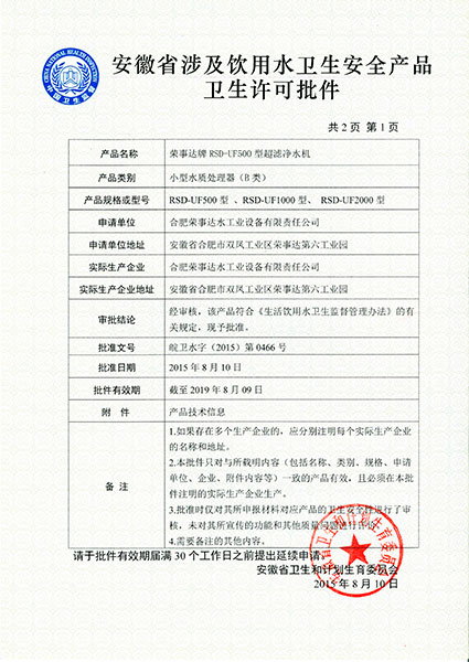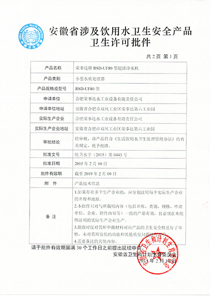 RSD-UF80型超濾凈水機衛生許...
